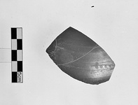 | Description: | Shoulder fragment. Round-bellied form. Remains of floral scroll, incised with white dot-rows and ivy-leaf (faint). Light yellow-brown ware; metallic red gloss on outside. 'Pontic' Terra Sigillata? | |