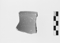 Description:   Rim and wall fragment. Steep wall, hollow rim-band with flat exterior. Groove at mid-height on each face. Spatula marks on exterior.
