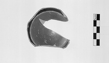 | Description: | Half of foot and floor, with bottom of wall (two joining pieces). Vertical wall with small flange at bottom, shallow floor, tiny foot ring. Fine striations on wall, fine groove around a tiny stamp on floor. Stamp: (small planta pedis). Italian Terra Sigillata. | |