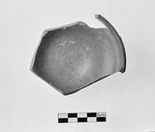 Description:   Lower part, and one side up to rim. Shallow bowl, of flaring form, with tilted foot ring and overhanging vertical rim with flange at bottom. Square cut lip, slightly grooved on inside.