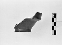 | Description: | About half preserved, mended from three pieces: lower part, some of rim. Low squarish foot, conical bowl, flaring at top, with a near-vertical rim above. Grooves and mouldings on inside of rim. Small offset on bottom. S-curved internal body-profile. Rouletting in band at top of bowl (and traces on rim). A foot-shaped stamp in the center of the floor: <graphic> Light yellow-orange; red-slip, dark and flaked on inside. Eastern Sigillata 'A'. | |