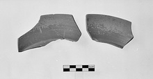 | Description: | Two pieces of rim and wall (three sherds). Steep sloping wall, with a plain rim marked off by groove; edge of a flat floor preserved. Fairly thin walled. Fine orange ware (mica traces); red slip, thin and dull on outside, glossy (but worn at top) on inside. Probably Pergamon ware, Loeschcke. (Candarli) form 26A. | |