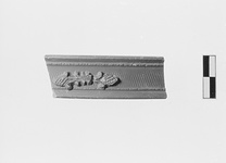 Description:   Vertical rim with double moldings at top and bottom; between these, fine rouletting and a double-ended applied pine-cone and volute ornament.