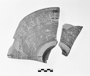 | Description: | Four joining fragments, one non-joining, form part of one side, base to rim.Wide shallow sloping floor, low heavy foot near center, low upcurved sloping rim. No decoration. Light yellow-orange, with damaged semi-gloss red slip. Eastern Sigillata 'A'. | |