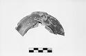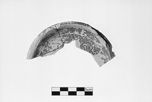 | Description: | Three joining fragments, giving one side, from rim to base; central area lost. Flattish floor; vertical rim with broad flanges at rim and bottom; remains of a low foot. Fine grooving on inside, under lower flange and inside foot. Light red clay. Good red gloss, flaking badly. Eastern Sigillata B1 ware. | |