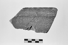 | Description: | Fragment of Laconian pan tile with uneven brown glaze on the exterior. Full inscription is preserved and reads: <graphic> Brown fabric with moderate-sized white and black inclusions. | |