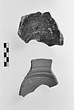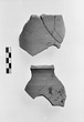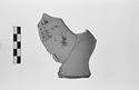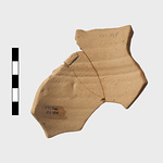 | Description: | Single fragment as P 32365 but from smaller vessel. Portion of top edge preserved, as is part of draw hole toward lower edge. Broad sweep of paint on right side of exterior; much worn; paint mottled red and black. Interior reserved. Clay body and reserved surfaces fired close to pink 7.5YR 7/4. | |