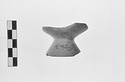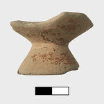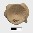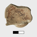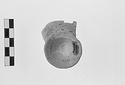 | Description: | Single fragment preserving entire base and portion of lower body of wall; from an open vessel, probably a one-handled cup. No edges or draw hole preserved. Exterior painted, except for possible reserved band on lower foot. Interior also painted, save for small reserved disk at center. Paint much worn. Clay body and reserved surfaces fired close to pinkish gray 7.5YR 7/2 (the result of reduction firing). Cf. P 17245. | |