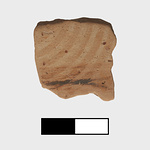 | Description: | Single fragment preserving very small portion of test piece. Fragment from body of undetermined vessel (perhaps closed?). Exterior canonically decorated: portion of one set of compass-drawn circles above, partially overlapping with broad band below. Paint fired black where thickest; red where dilute on circle. Irregular sweep of paint on interior, mottled red and black. Clay body fired light gray at points; elsewhere clay body and surfaces fired close to pink 7.5YR 7/4. | |