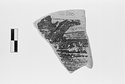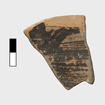 | Description: | Single fragment preserving portion of test piece, including one edge. Piece cut from body of large closed vessel. Paint on interior and exterior fired black. Portion of horizontal band on exterior. Vertically and horizontally intersecting lines on interior. The greater part of clay body fired close to light gray/gray 7.5YR N6/. Outer part of clay body, reserved surfaces and clay at edge fired close to pink and light brown 7.5YR 7/4-6/4. | |