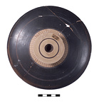 | Description: | Complete except for chips, mended from nine fragments. Broad, flat handle/knob, slightly concave on sides, with conical depression in center. Convex top. Reserved: resting surface, a zone near the stem decorated with thin glazed lines, the edge, part of underside, and top of the knob, the latter with a glazed circle. Added red: two lines at juncture of reserved zone, two lines at midpoint of glazed part of top, possibly where top turns down toward edge. Slight out-turn at rim. Black glaze, fired reddish in places, particularly within. Attic clay. Virtually the same as Agora XII, no. 1229, 520-500 B.C. | |
