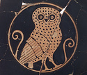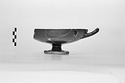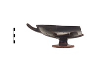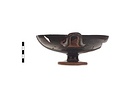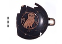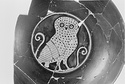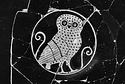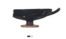 | Description: | Mended, about three-quarters preserved. Torus disk foot, rising within. Two scraped grooves at juncture of foot and stem. Reserved: center of underside, resting surface, face of foot, inside of handles and handle panels. Decoration within: Tondo of reserved line, with owl and tendrils within. Owl stands right, spotted except for wing feathers. Simple tendrils on either side. Ghost image of curving leaves and letters discernable to right of owl: D. von Bothmer (August 1995): Sabouroff Painter, ca. 490 B.C. Cf. Agora XII, no. 420, ca. 500-480 B.C. | |