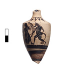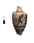 | Description: | Body of small lekythos preserved, missing foot, handle and mouth. Painted scene of front only: maenad between two satyrs. She moves right, looking back over her shoulder at satyr grasping her arm. Second satyr approaches from right. Branches in background. Use of incision, no added red or white survives. Rays on shoulder. Class of Athens 581, ii, cf. Agora XXIII, nos. 1079-1087, early 5th. B.C. | |