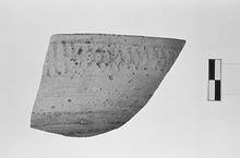 | Description: | Single fragment preserving portion of rim and upper body of kotyle similar but different to P 32437. Fragment significantly distorted due to heat. Interior painted except for preserved band at lip, decorated with one preserved set of five vertical strokes. Paint on exterior much worn. Lower wall painted. Area above evidently decorated with horizontal bands, mostly not preserved. Rim decorated with vertical stripes and lozenge chain. Two thin bands at lip. Paint fired dark brown approaching black. Reserved surfaces fired close to light brown and pink 7.5YR 6/4-7/4. | |
