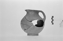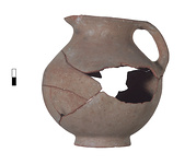 | Description: | Mended from five pieces. Some large body fragments missing. Flaring ring foot, squat body, broad neck, trefoil mouth. Brittle, coarse cooking ware fabric, lots of mica and white inclusions. Dark brick-red clay. Cf. Agora XII, no. 1655, ca. 500-480 B.C. | |