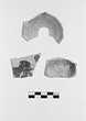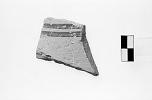 | Description: | Single fragment preserving small portion of test-piece. Cut from lower body of large closed vessel. Well-fired. Two thin bands on lower wall on exterior. Irregularly applied test-paint on interior. | |