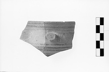 | Description: | Two joining fragments preserving small portion of rim and upper body of skyphos, including both stumps of one horizontal handle. Fabric and paint misfired. Handle zone on exterior decorated with group of verticals (ten preserved), above three bands, and area painted solid. Four thin bands above. Interior painted solid except for thin reserved band at lip. | |
