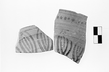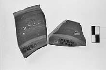 | Description: | Two joining fragments preserving small portion of rim and upper body of plate. Upper body near rim badly misfired. Preserved paint fired from red to brown through black. Row of leaves on lower preserved exterior, in double outline with stroke at center. Above, a row of dots framed by thin bands above and below. Interior painted solid, except for reserved band near mid-point. Rim top reserved. Late Geometric. | |
