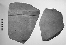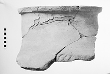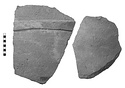 Description:   Fragment a), made up from five joining fragments, preserves almost half of rim and neck; fragments b) and c) do not join (fragment c) may be from another pithos). Upper wall curving in to relatively short neck and thick projecting rim, flat on top, almost square in section. Surfaces well smoothed. Fragment c) preserves part of applied band (undecorated).