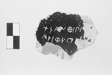 Description:   Single fragment preserving the top of the stem and the bottom of the bowl of a kylix. On the interior is inscribed the name and patronymic of Xanthippos Ariphronos: <graphic>