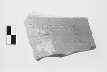 Description:   Single fragment from the wall of a coarseware vessel. On the exterior is inscribed the name, patronymic and demotic of Xanthippos Ariphronos Cholargeus: <graphic>