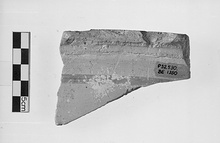 | Description: | Two joining rim fragments of a large open vessel, glazed within and banded on the outside. Just below the rim is inscribed the name of the Themistokles, turning at a right- angle along the break. <graphic> Pink, medium-fine grained fabric, with reddish-orange glaze. Cf. Agora XXV, pp. 103-132. | |