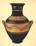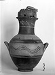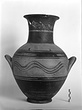 Description:   Neck mended from many pieces; a few small ones still missing. Ring base; swelling body with greatest diameter above center; neck distinct from body, but flares slightly to meet it; ends above in flaring rim; cylindrical handles set horizontally at point of greatest circumference.