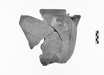 | Description: | Three non-joining rim and body fragments: a) Mended from nine fragments preserving rim, body, and stumps of one handle. b) Two joining rim fragments. c) Two joining rim fragments. Large baggy body, short sloping shoulder. Groove at junction with up-turned projecting rim. Interior of rim with wide groove and sharp ridge for lid. Large horizontal handle, round in section, at junction of shoulder and body. Very coarse, heavy fabric. Gray core with large white inclusions and a little mica. Surface red-brown with carbon. Second example from same deposit. | |