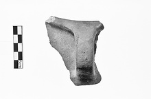 | Description: | One fragment preserving part of rim, handle and shoulder. Slightly convex shoulder narrowing to rounded projecting rim with narrow, rounded groove on top surface; thick strap handle from junction of shoulder and body to rim. Coarse gray clay with large white, orange and mica inclusions; finished smoother on exterior. | |