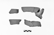 | Description: | Three non-joining fragments: a) 4 joining sherds preserving almost half of rim, start of shoulder and one handle; b) 2 joining body sherds; c) single rim fragment. Baggy body; slightly flaring tall rim with rounded lip. On interior of rim projecting flange with groove and ridge for lid. Wide groove above. Horizontal handle at shoulder, round in section. Coarse pink-red micaceous clay with white, gray, black and gold mica inclusions. | |