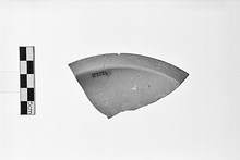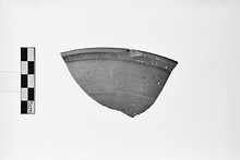 Description:   Single fragment from rim and part of body. Shallow rounded body (slight carination), narrow flat-topped tapering rim. Hayes (LRP) form 7, small. Undecorated.