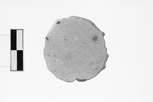 | Description: | Intact. Small, roughly circular chipped clay disk fashioned from the body of a large closed vessel. Original decoration does not survive, though "ghost" traces of two horizontal bands are visible under good light. Clay pink 7.5 YR 8/4. Cf. P 32704 to P 32717. | |