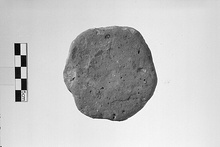 | Description: | Roughly circular large chipped clay disk "counter" fashioned from the body of a large coarseware vessel, almost certainly a pithos. Exterior surface slightly better finished than interior. Clay on interior surface close to light red 2.5 YR 6/6; closer to light brown 7.5 YR 6/4 on exterior surface. | |