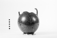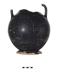 | Description: | Mended from many fragments. Missing neck and rim, a few body sherds and edge of foot. Flaring ring foot, spherical body, strap handles oval in section and with grooved underside. Black glaze on inside of neck, exterior. Attic clay with a few white inclusions. Shape similar to Agora XII, no. 20 but larger. ADDENDA Fragment of foot found in tin, level 7a | |