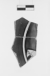Preserves edge of back of head of male to right. Narrow reserved contour of hair with small black glazed circles for curls overlapping. Below at left, patterned pillow. Relief line: contour, details of pillow. Exterior: streaky black glaze. Interior dull.