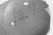 | Description: | Western Sigillata bowl broken but profile complete. High base ring; hemispherical bowl; slightly projecting keel. On the inside one circular groove around the floor. In the middle, a plantaform stamp: <graphic> Russet clay; good red glaze. | |