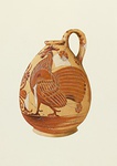 | Description: | The mouth broken away; otherwise complete save for a few pieces from the body; mended from many fragments and restored in plaster. Between two cocks, a large floral ornament, outlined by incision. Filling ornaments: incised blob rosettes and petal rosettes, each petal outlined by incision. Yellow-buff slip over pink clay; the glaze fired red throughout. Abundant added red on the ornament, and on the cock's crests, wings and tails. Free use of incison. Attic Orientalizing. | |