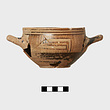Description:   Mended from many fragments, preserving complete profile and most of vessel, including both handles. Paint worn. Flaring lower wall with rounded shoulder and slightly everted, tall vertical lip; disk foot, concave below. Interior painted solid except for reserved band on inner lip decorated with sets of vertical strokes, and dot in center. Exterior lower wall painted solid; on shoulder: broad hatched maeander framed by eight vertical lines; outer lip banded. Handle painted on exterior only.