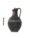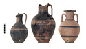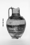 Description:   Mended from many fragments. Nearly complete, missing one-third of rim and several body fragments. Glaze worn. Ring foot, ovoid body with gentle curve from body to neck; trefoil lip, strap handle from rim to shoulder. Whole body painted solid except for one reserved zone with two horizontal bands on belly just above point of greatest diameter. Neck panel opposite handle with hatched maeander framed above and below by two black bands. Reserved: strap handle, striped on outer face; resting surface and underside.
