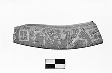 | Description: | Single rim fragment. Glaze worn and chipped. Overhanging rim of a household lekanis with brown slip on rim only. Inscribed on top surface part of the name Themistokles. Thickness of incision varies. <graphic> Orange micaceous fabric, buff on surface; red-brown glaze. Cf. Agora XXV, nos. 664-1049. | |