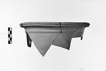 | Description: | Almost whole of rim (eight joining fragments). Cylindrical form with flaring rim, hollowed a little on top (sharp inner edge, grooved lip). A small moulding at top of wall, with traces of handle-attachments (two?) just visible immediately below, in broken areas. Thinnish brown ware, rather fine-textured, with yellower surface wash. Slight wheel-marks on interior. Could this be a beehive of earlier date than the deposit? Similar shape with related rim-treatment: I.R. Metzger, in Ducrey et al. (1993), Eretria VIII, Le quartier de la Maison aux mosaiques, p. 112, no. 76, Abb. 172 with comments p. 116 (in building destroyed ca. 300B.C.) JWH, Nov. 1998. Cf. P 33074. | |