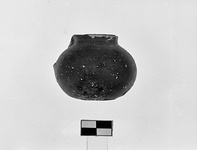 Description:   The handle missing. Round body with short straight lip; flat bottom, left rough; vertical handle.