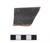 | Description: | Fragment mended from two pieces (broken during storage) and broken along three sides preserving part of rim. Plain lip, thickened and rounded on the interior, meets exterior face of rim/wall at sharp angle. Fragment from a bowl (?), with a vertical rim or wall. Exterior with West Slope myrtle garland above a scraped groove. Fine orange fabric. Shiny, slightly metallic black gloss interior and exterior. | |