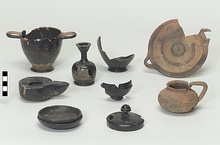 | Description: | Mended from many fragments, preserving entire foot and part of wall. Flaring ring foot, reserved circle with miltos on underside. Orange-buff fabric, black glaze. b) Joined piece not mended. Cf. Agora XII, nos. 322, 324, ca. 400 B.C. | |