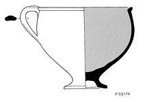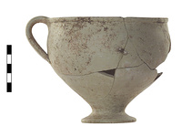 | Description: | Mended from several fragments. Two small loose fragments. Largely complete but missing fragments from body. Thickened outcurving rim, slightly offset. Deep bowl, low stem. Sloping spreading foot with wide deep depression underneath. Strap handle rising slightly above rim, attached just below greatest diameter. Buff fabric; pinkish slip still evident on one side; remains of dark brown glaze on whole interior. | |
