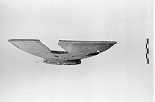 | Description: | Much of side wall missing. High base ring, coarsely moulded; deep body; the rim thickened by being rolled inward. Buff clay. Metallic black glaze much flaked. Traces of stacking on the floor. | |