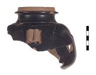 a) Rim and body. Mouth flanged to receive lid. Concave neck offset at junction with shoulder. One double tube handle preserved, pierced vertically for string.
