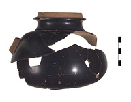 Fine orange clay, buff on interior; shiny black glaze. Some fragments tinged gray from fire.