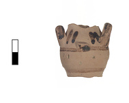 | Description: | In one piece; missing neck, rim and the vertical handle. Wheelmade; disk foot not trimmed (string marks underneath). Spherical body. Two high loop handles at shoulder. Stump of vertical handle attached at midpoint of body. Painted decoration: two horizontal lines, one above foot, one at midpoint of body; vertical strokes on shoulder. Handles glazed. Buff-pink clay with large white inclusions. Glaze black to brown. | |