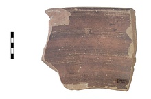 | Description: | Single fragment of rim and wall with stump of one handle. Thickened, rounded rim; convex body, thick, round, up-turned horizontal handle. Glazed on interior, top of rim, two bands on exterior- above and below handle zone-exterior of handle. Fine orange clay, buff on surface; streaky orange-red to dark brown glaze. Cf. P 15093 (Agora XII, no. 1748) ca. 600-570 B.C. | |